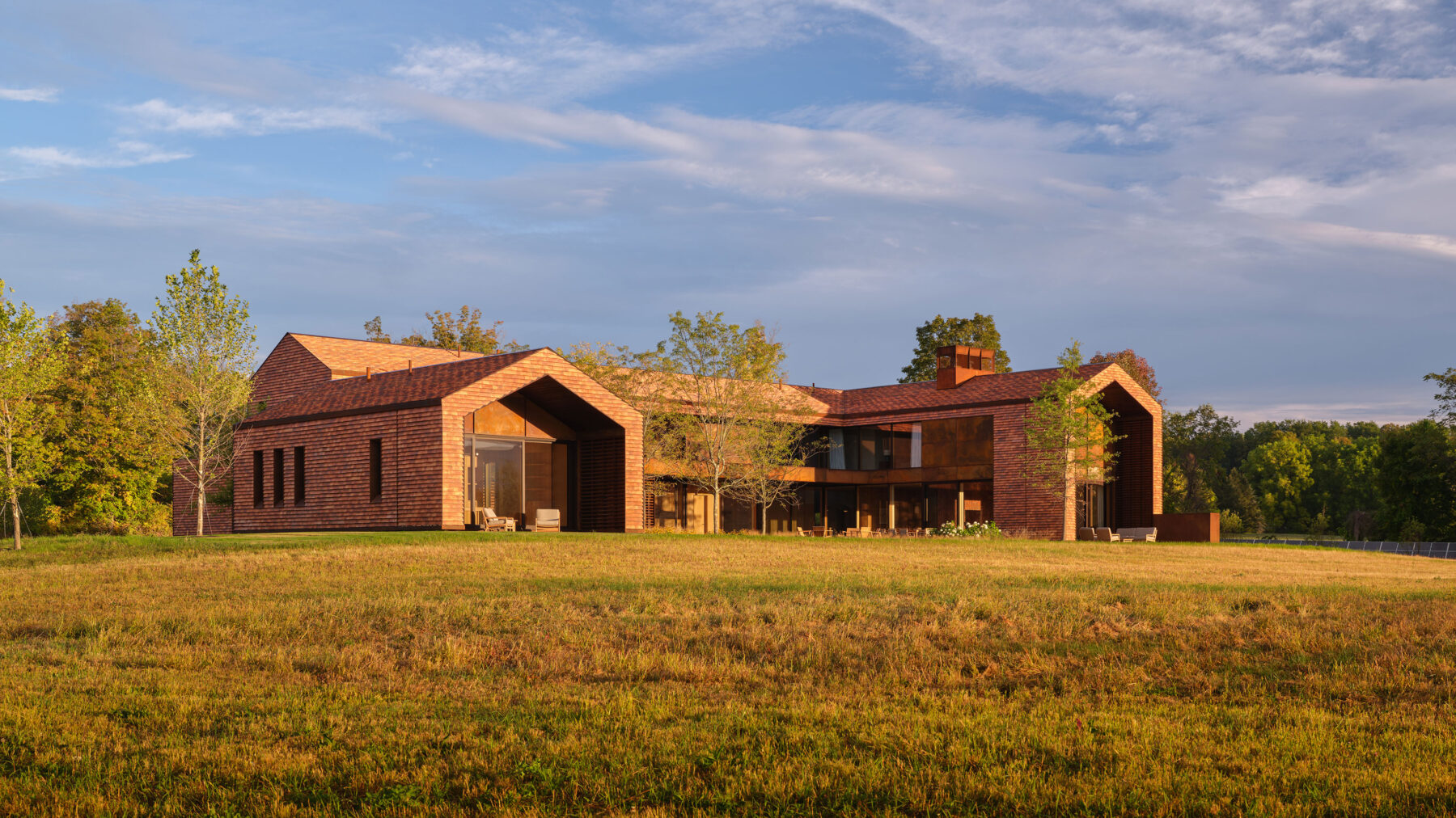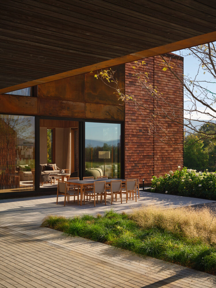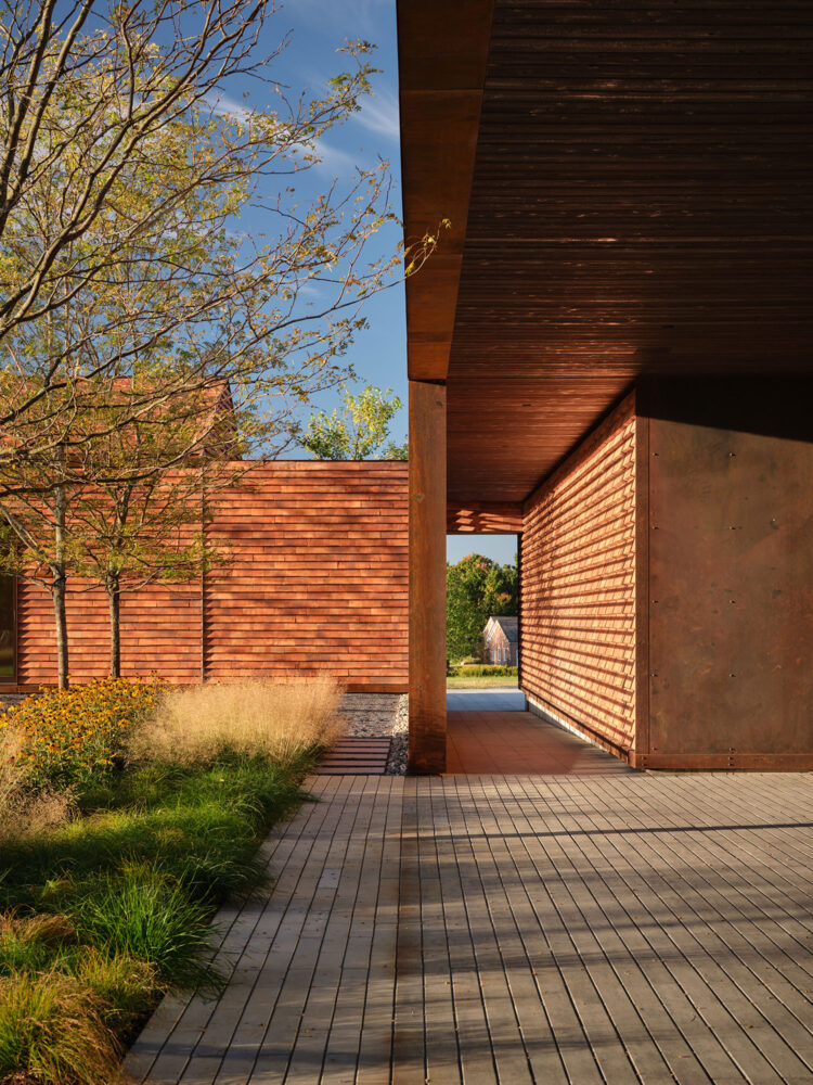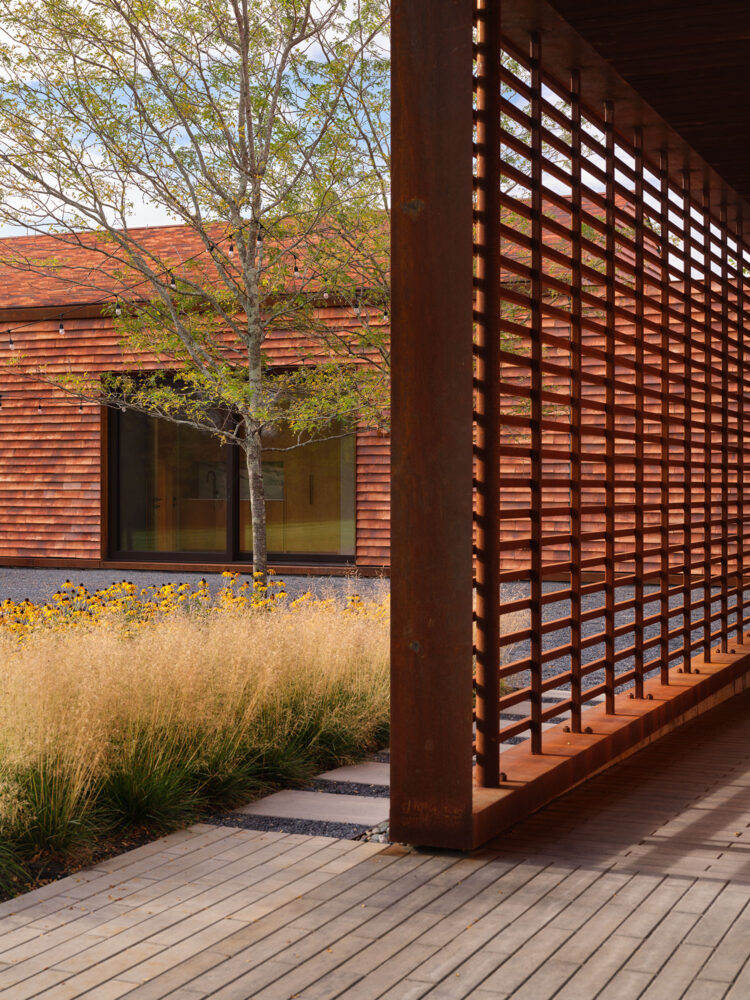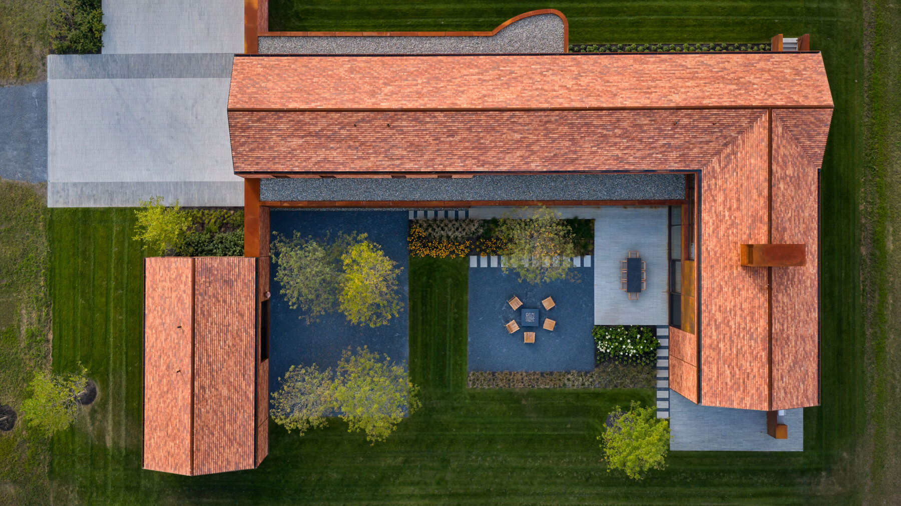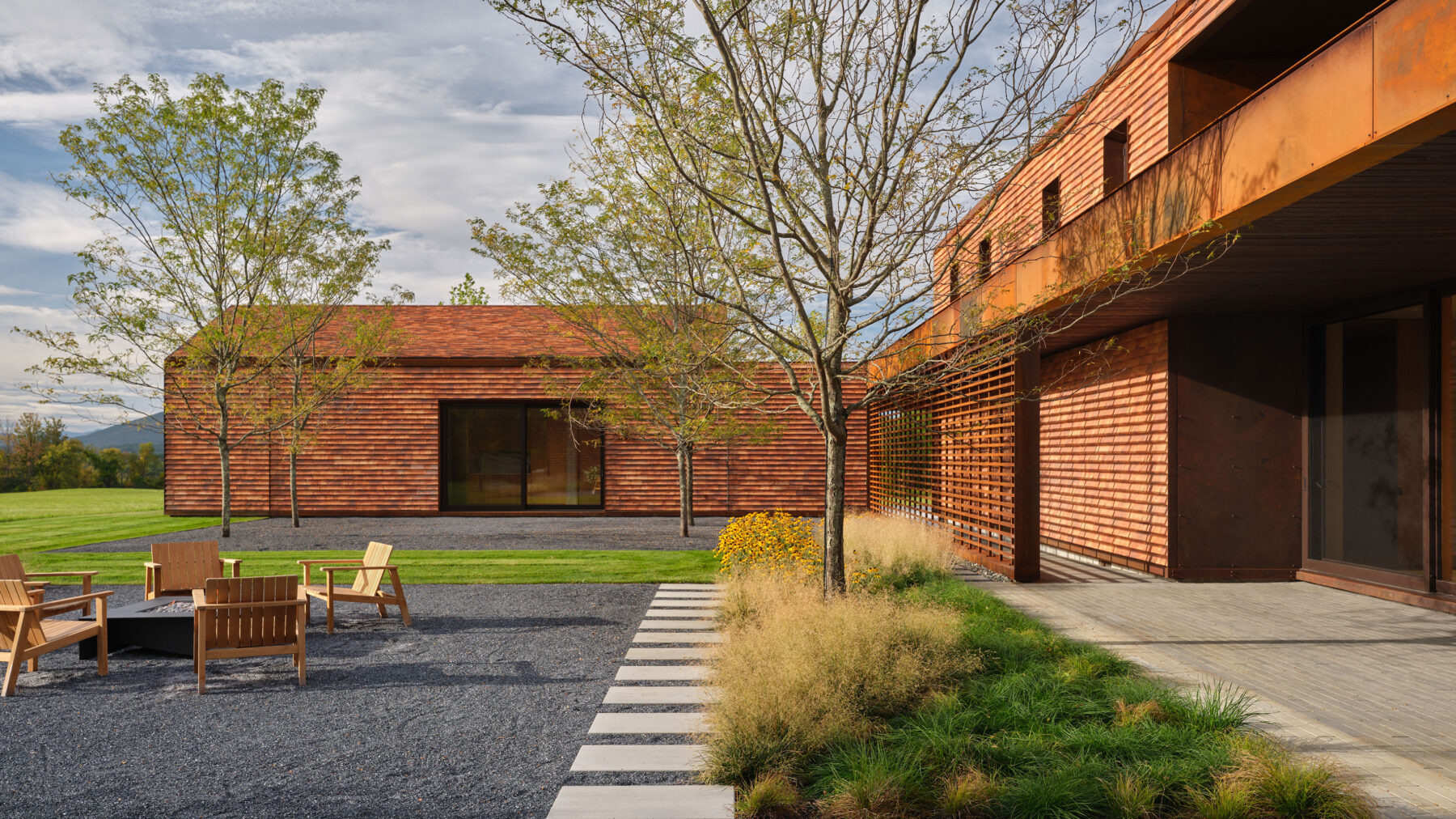 This modern family home was sited in a meadow and oriented to capture views of the surrounding agrarian landscape. WHLA worked closely with the architect and owner to develop a master plan for the home to accommodate family gatherings, entertainment, and retreat. Outdoor rooms are formed by the architectural lines to include a honey locust bosque, an outdoor fire pit area, and patios for both socializing and quiet reflection. A modern hardscape and minimalistic planting design compliment the architectural materials. Large mature native trees anchor the home in landscape creating a sense of permanence. The house and landscape draw on the region evoking a modern sense of place.