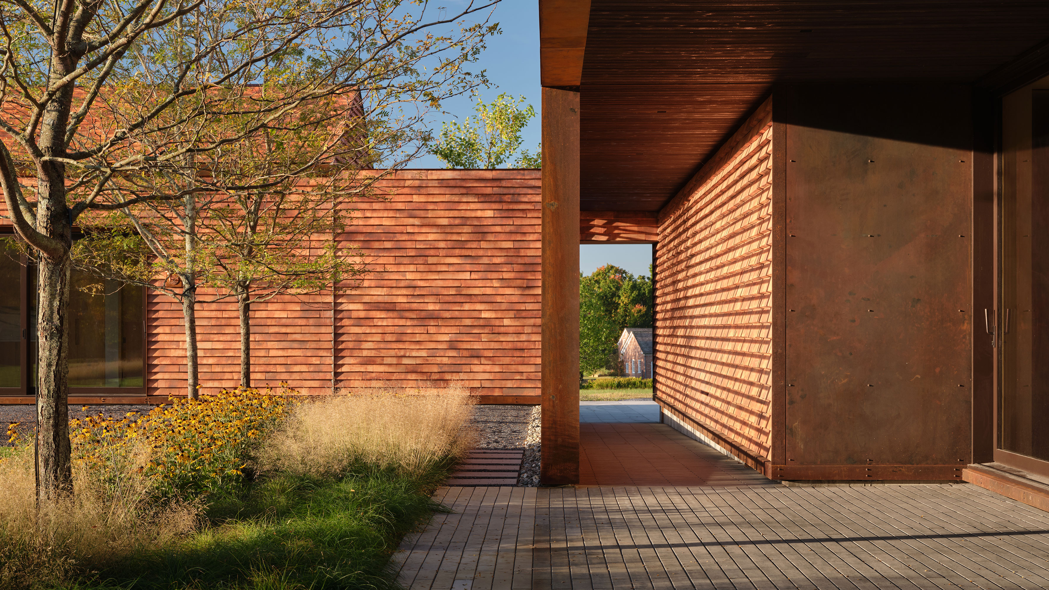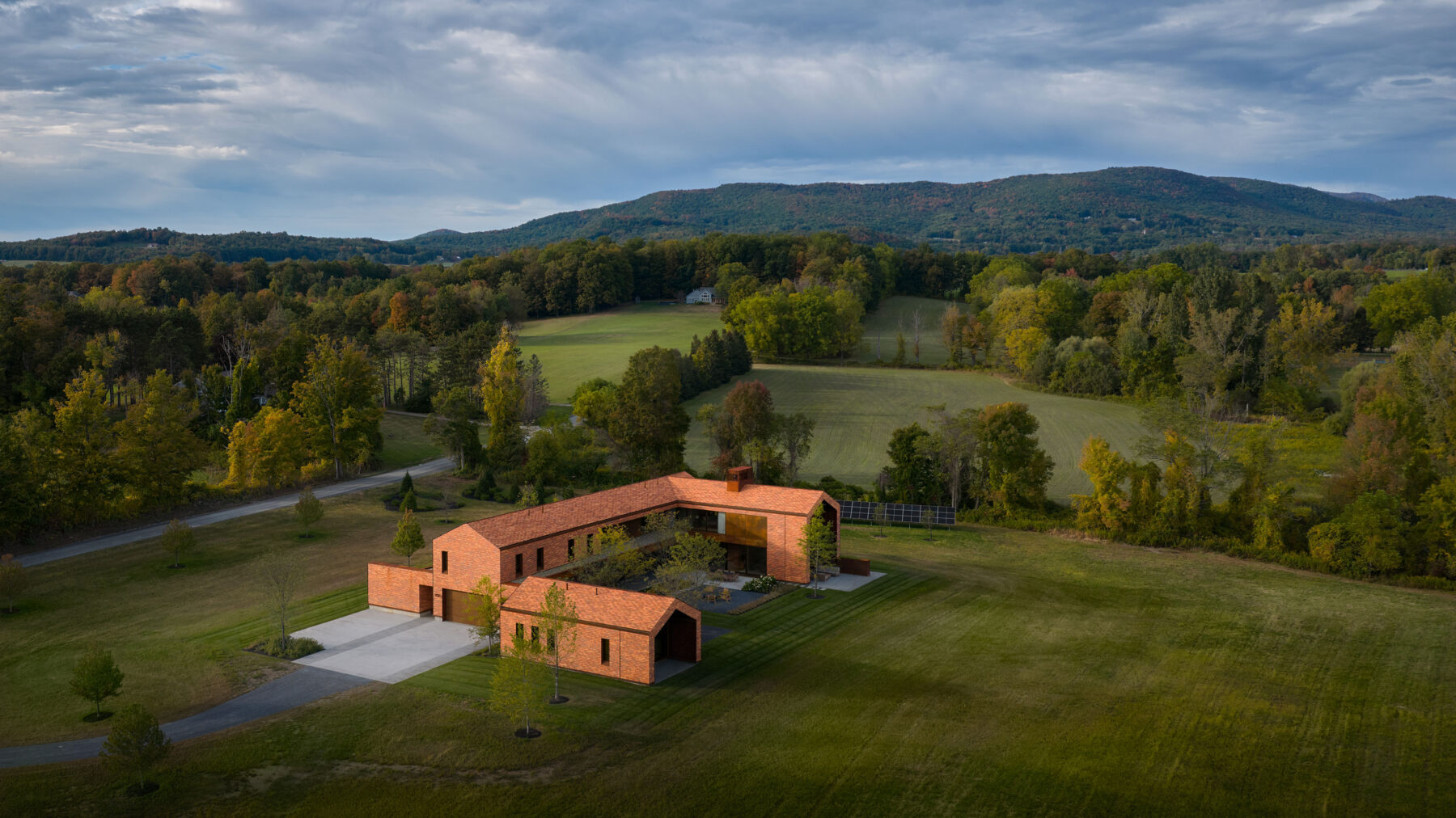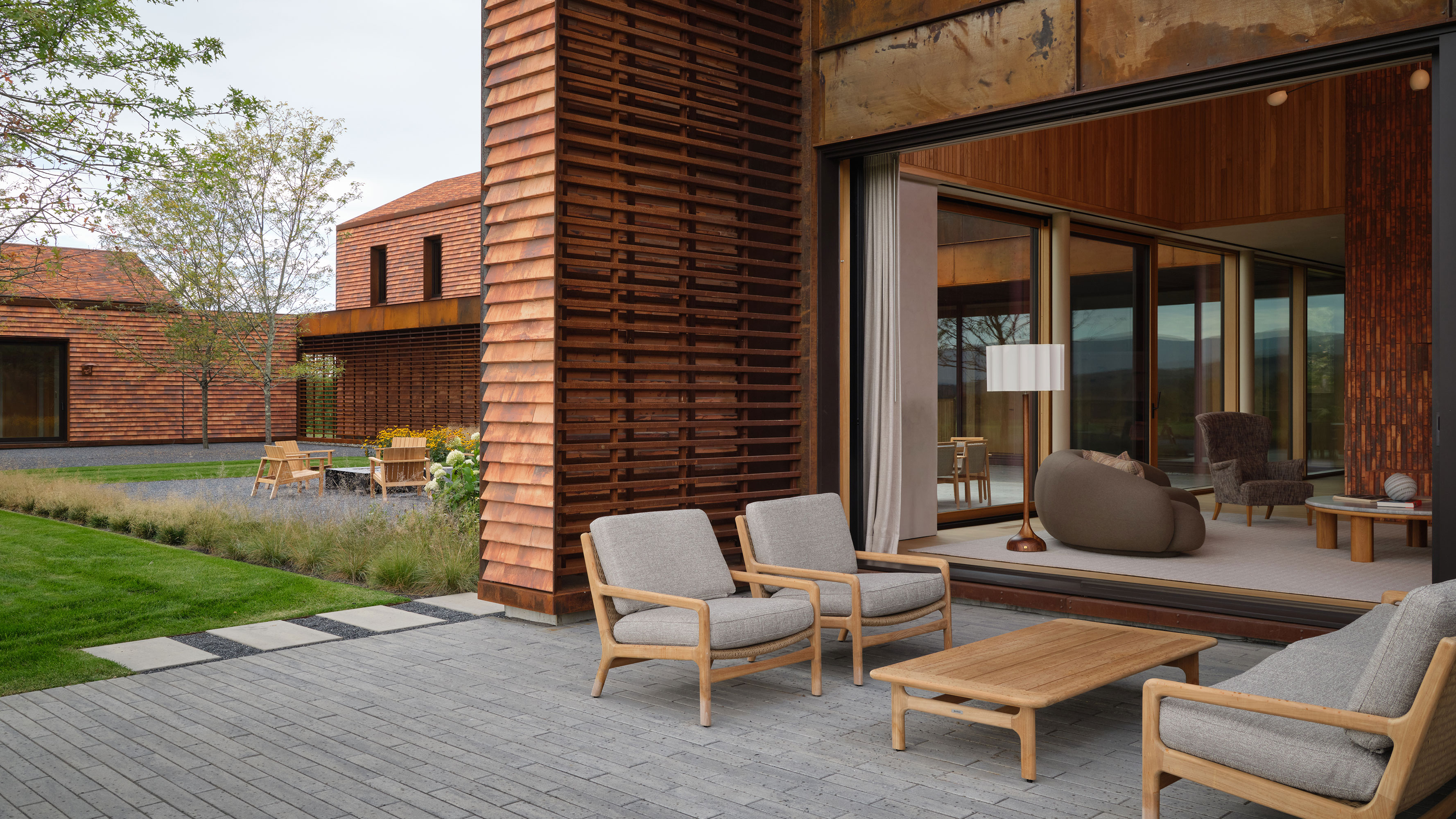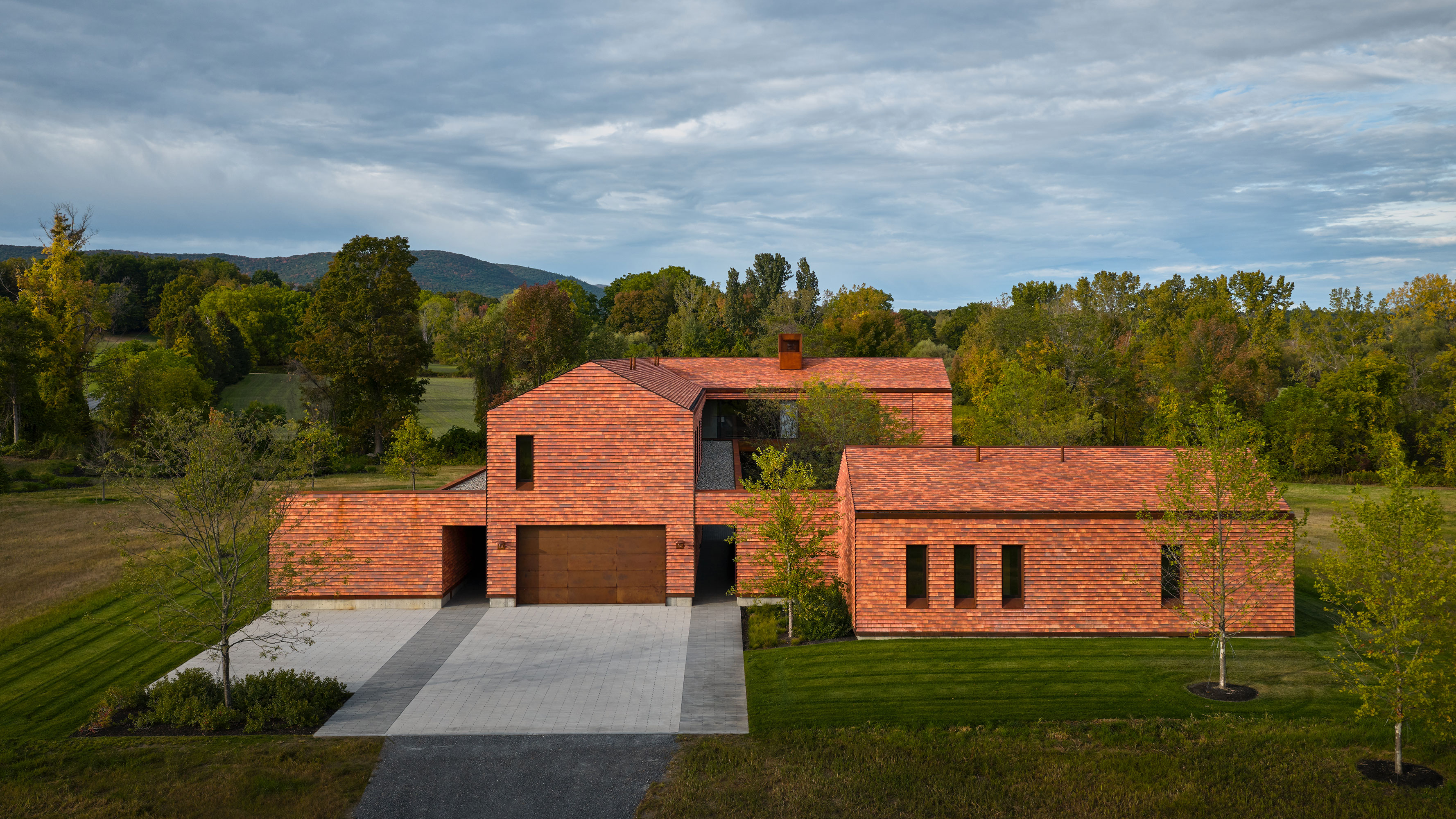 This modern family home was sited in a meadow and oriented to capture views of the surrounding agrarian landscape. WHLA worked closely with the architect and owner to develop a master plan for the home to accommodate family gatherings, entertainment, and retreat. Outdoor rooms are formed by the architectural lines to include a honey locust bosque, an outdoor fire pit area, and patios for both socializing and quiet reflection. A modern hardscape and minimalistic planting design compliment the architectural materials. Large mature native trees anchor the home in landscape creating a sense of permanence. The house and landscape draw on the region evoking a modern sense of place.